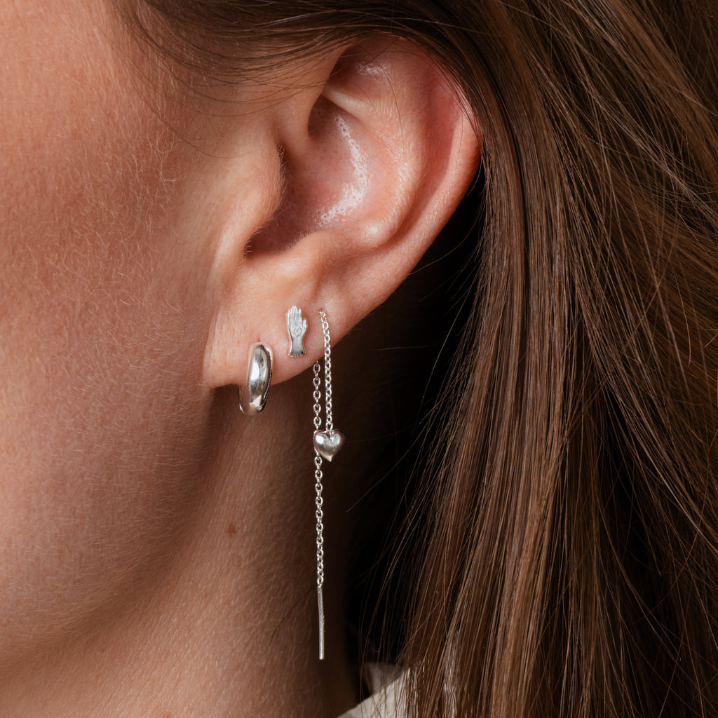 Studs in de vorm van een handje, in het midden van het handje staat een hartje. Gemaakt van 925 zilver.