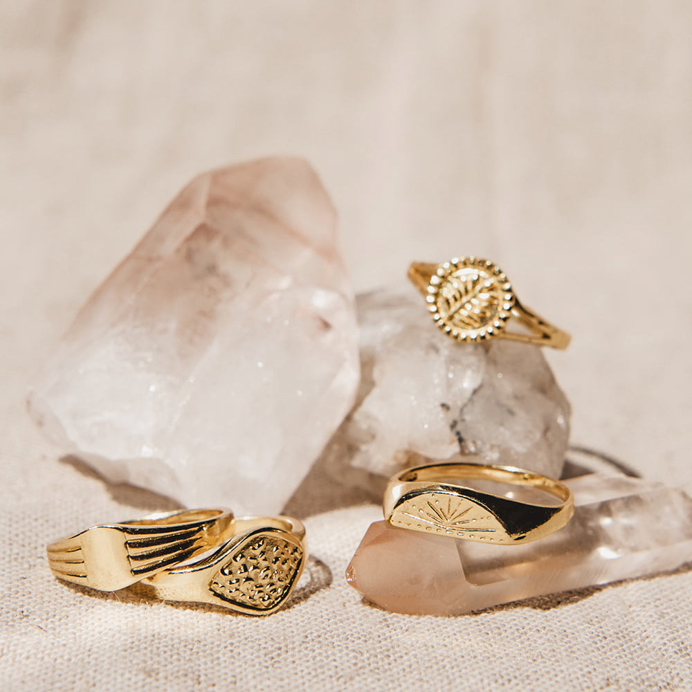 Naast de zegelring met sunrise motief hebben we ook prachtige gold plated ringen met leaf, panter, bumble bee en andere graveringen. Wees niet te bescheiden en durf ze ook rustig met elkaar te combineren